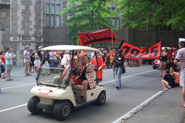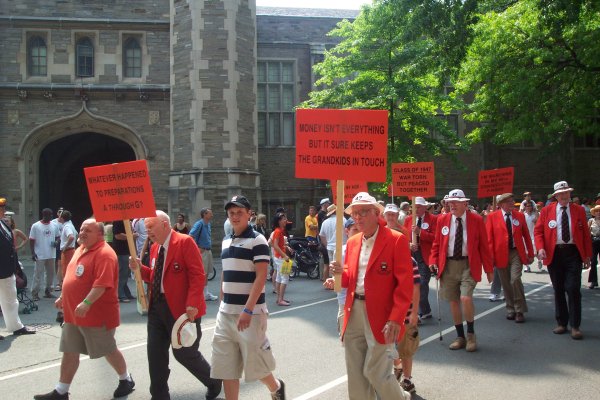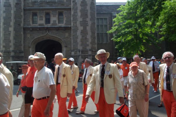 یکی از مراسم دانشگاه پرینستون هرسال گردهمایی فارغالتحصیلان یا به قول خودشون گردهماییهاست (Reunions) دلیلش هم اینکه معمولا بقیه جاها هرسال گردهمایی یک کلاس خاص برگزار میشه ولی اینجا هرسال همه کلاسها هستند. کسایی که میخوان شرکت کنند از قبل با زن و بچهها و حتی سگ و گربهشون ثبتنام میکنند. برنامه به طور رسمی 4 روزه. صبحها سخنرانی و گردش و ناهار و این برنامههاست. شبها هم برای هر پنج دوره یک چادر هست و توش برنامه موسیقی و لهو و لعب به راه است! ما که نرفتیم!! ولی ظاهرا تا 3-4 صبح برنامه به راه بوده مخصوصا چادرهای پنجم و دهم (یعنی کسایی که در 5 سال گذشته و کسایی که بین 6 سال تا 10 سال گذشته فارغالتحصیل شدهاند) که خب همه جوون و اهل حال بودهاند. روز آخرش هم که همین شنبه بود رژه معروف P-rade بود که همه کلاسها به ترتیب دو طرف خیابون اصلی دانشگاه زیر پلاکاردی که سالشون رو نوشته ایستاده بودند و بعد اول از همه دوره 25 که امسال میشد فارغالتحصیلهای سال 1982 رژه رو شروع کردند. بعد از اون نوبت قدیمیها یا Old Guards بود که امسال قدیمیترین شرکت کننده فارغالتحصیل سال 1925 بود. یعنی 104 سالش بود. بعد از 1925 نوبت سال 1932 بود و بعد به ترتیب سالهای بعدی پشت سر اونا راه میافتادند. هرگروهی یه مدل لباس خاصی پوشیده بود و یه پلاکاردهایی دست گرفته بودند که جملههای خندهدار یا یه نکته راجع به دورهشون روش نوشته بودند. ما برای اینکه تو سایه باشیم کنار 2002ایها بودیم که اونا هم چون گردهمایی پنجمشون بود (گردهماییهای ضریب 5 معمولا مهمترن و آدمهای بیشتری میان) کلیهاشون اومده بودند و شلوغ میکردن و قوطی قوطی آبجو میخوردند. همون شب هم تو یه محوطه باز پشت استادیوم کنسرت موسیقی بود که فکر کنم همه اعضاش فارغالتحصیلهای دانشگاه بودند. بعد از اون هم مراسم آتشبازی بود که با موسیقیای که از بلندگوها پخش میشد هماهنگ کرده بودند و خیلی جالب بود و حیف که دوربین فیلمبرداری نداشتیم. سال دیگه انشالله!