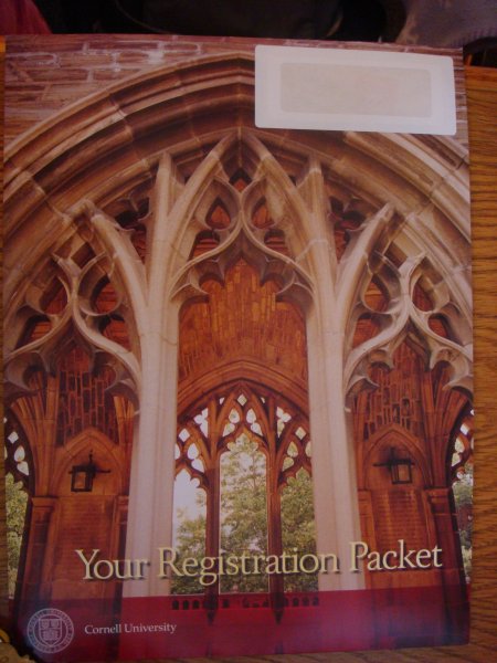روز دوشنبه روز ثبتنام بود. وارد سالن که شدم بر حسب حرف اول فامیل تو یه صفی وایسادم. اونجا یکی یه پوشهای که اسم و مشخصات روش نوشته شده بود میدادن. توی پوشه کارت دانشگاه بود که اگه قبلا online عکس فرستاده بودی آماده بود وگرنه همونجا ازت عکس میگرفتن. بعد توی پوشه یه برگه بود که به ترتیب نوشته بود که چه مدارکیت ناقصه و برحسب اون میرفتی سراغ میز مربوط به همون کار. کل روند فرقی با ثبتنامی که تو ایران میکردیم نداشت به جز یه فرق اساسی که قبلا همه فرمها یا online بود یا برات فرستاده بودند و تقریبا همه کارا با اینکه مجبور نبودی میتونستی از قبل انجام داده باشی. اینم پوشهای که میدادن.