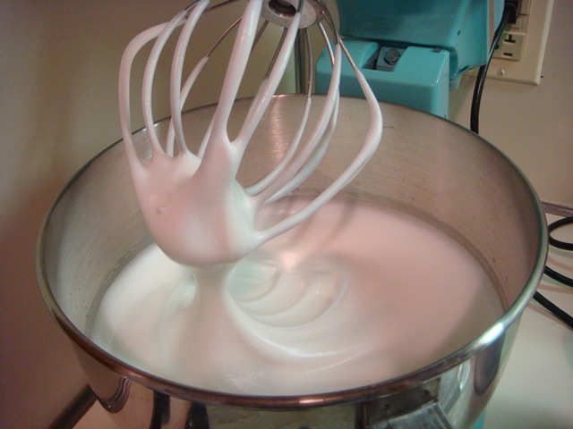 سفیده تخممرغها رو با همزن رو سرعت بالا به هم بزنید و یه مقدار کمی که شروع به کف کردن کرد نمک کرم تارتار، عصارههای وانیل و بادام (یا پودرش) و پودر شکر رو اضافه کنید. و انقدر بزنید تا کاملا سفید بشه طوری که اگه همزن رو ازش در بیارید فوری برنگرده سرجاش.
