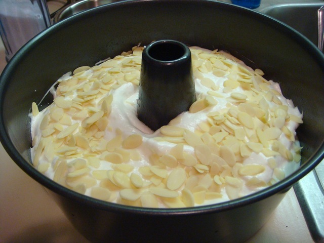 بعد مخلوط آرد و شکر رو یواش یواش بهش اضافه کنید. دیگه با همزن برقی هم نزنید که پفش بخوابه. با یه قاشق فقط اونقدر قاطی کنید که آرد دیگه دیده نشه. این رو توی ظرف کیک بریزید (دایره ۲۳-۲۴ سانتی یا ۹-۱۰ اینچی) و روش خلال بادامها رو بریزید. بسته به سطح ظرف یا مقداری که بادام دوست دارید کنتر یا بیشتر از یه پیمانه ممکنه مصرف بشه البته.